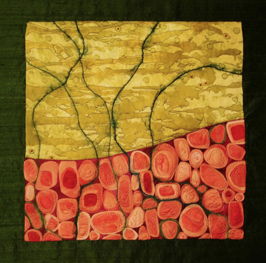 "Karen Kamenetzky’s art dazzles the eye, the skin, the mind. Lush color, sensuous textures, and dynamic compositions combine to form organic abstractions of subatomic life. She fuses intense, unexpected color combinations with forms that are deployed in sometimes rhythmic and other times syncopated patterns. Stitching becomes the top note of her jazzy riffs on the microscopic structures of our world."
