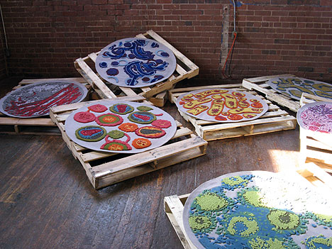 Dirty dishes is a series of hand tufted rugs by Hisey that were part of the elegant installation displayed at MADE. The small round rugs resemble petrie dishes under a microscope. Hisey based her patterns on viruses and bacteria. I found it interesting to learn that she leaves spaces thread bare to capture the decay brought with diseases like influenza, HIV and SARS. Yet despite these rugs having a dark concept and resembling various diseases, the rugs especially in a group are beautiful.