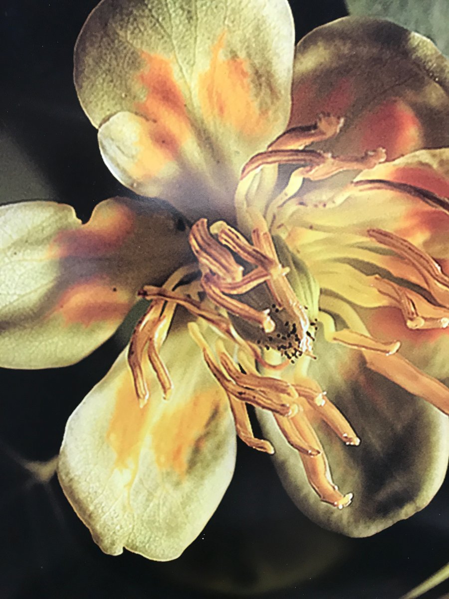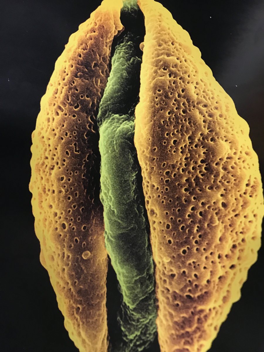 "There is a shared fascination of a scientists and artists when looking at the design of organisms too small to be seen without a microscope." Look beyond the larger object, e.g; the flower, and at the microscopic pollen grains. The grains are "enclosed beyond the accessible beauty. of the flower."