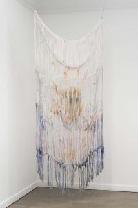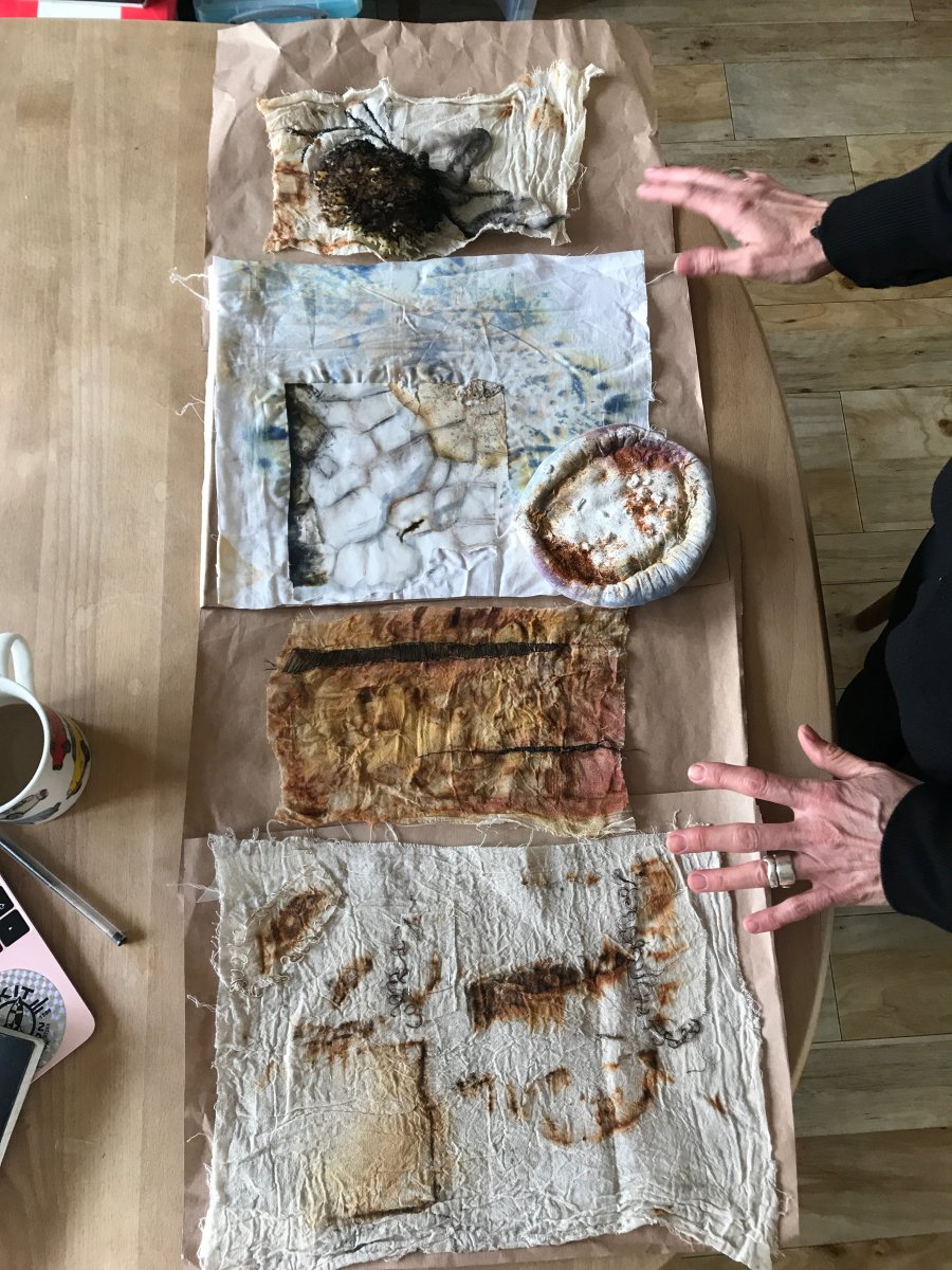 > The Sea anemone - “Again I love the muslin, clever use of materials (sea sponge), the rust print. Again theres the “gash” motif, however these are more like tendrils ( something growing - like the shoot of a plant).”
