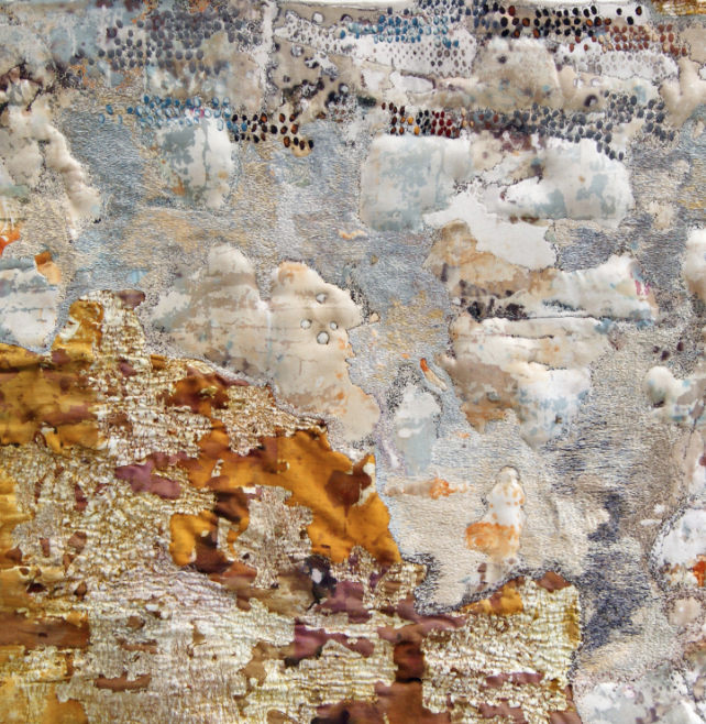 She works with print and stitch - her textures and colours are exaggerated and help reveal the complexity within the images. Each of her pieces evolve organically but are built up of layers of print, cloth, paper and stitch into 3 dimensional abstract forms.