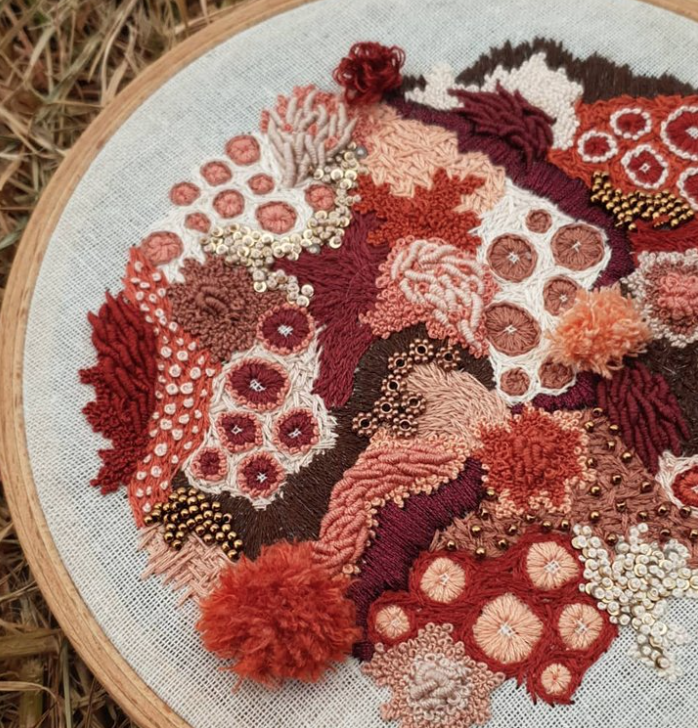 Hannah Kwasnycia, this is artist was also recommended to me by my peers following the group crit. Her work reminds me a lot of a previous artist I looked at and their "dirty dishes" collection. She is a young artist who lives in New Zealand and for a year has been spending her free time decorating embroidery circles with a needle and coloured threads. She uses various techniques - different stitches and knots, giving life to different textures. she is inspired by the natural world, recreating for example, rocks with moss or the seabed with algae and corals.