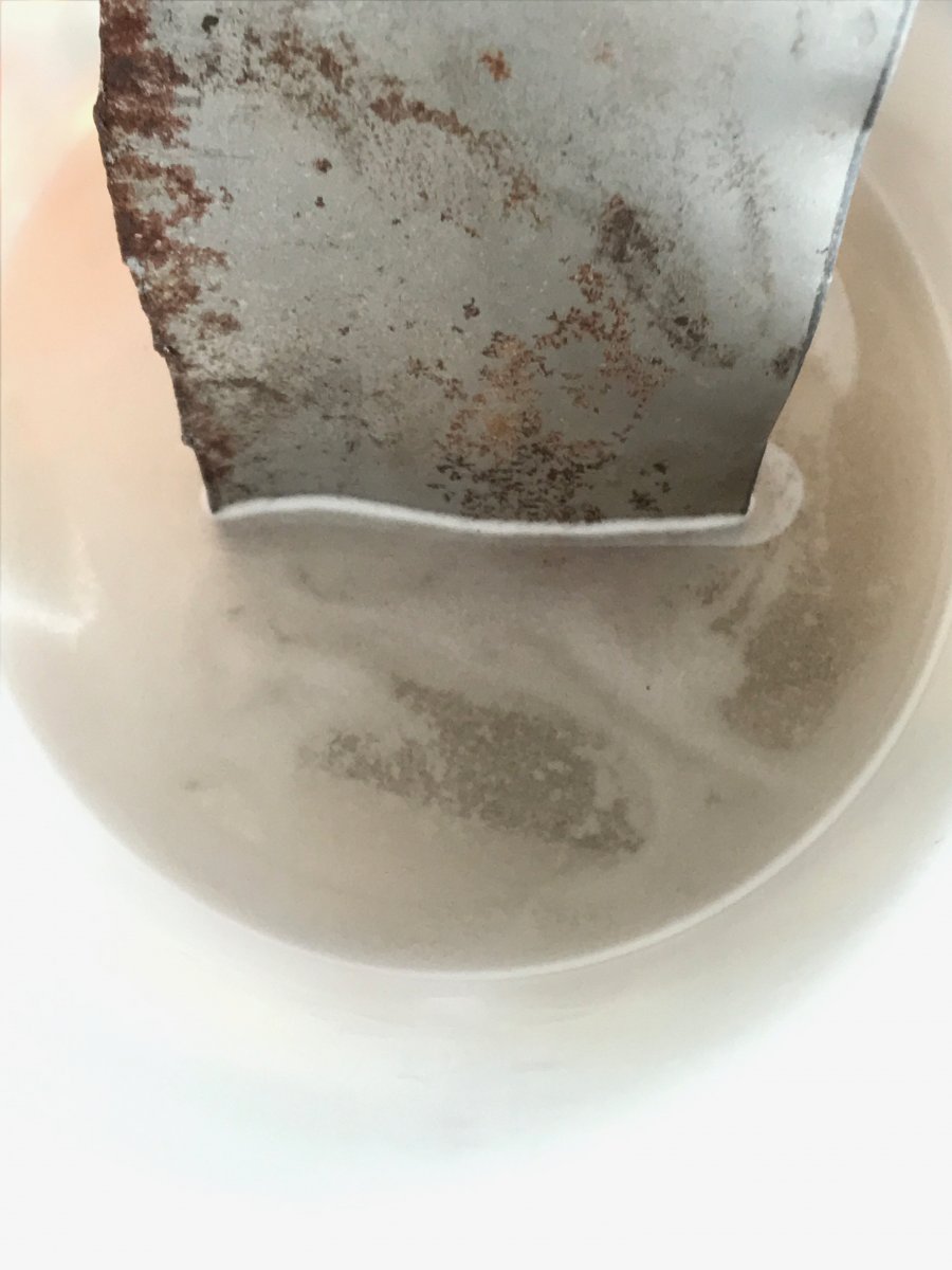 Within my progress meeting, we discussed and toyed around with me perhaps exploring ways I could make my own rust. After researching various methods in which to do this I eventually decided to make my solution by mixing white vinegar, salt and water together. I then added cut pieces of metal and placed it in a corner of the garden where it wouldn't be easily disturbed. I have been monitoring changes over the last couple of days.