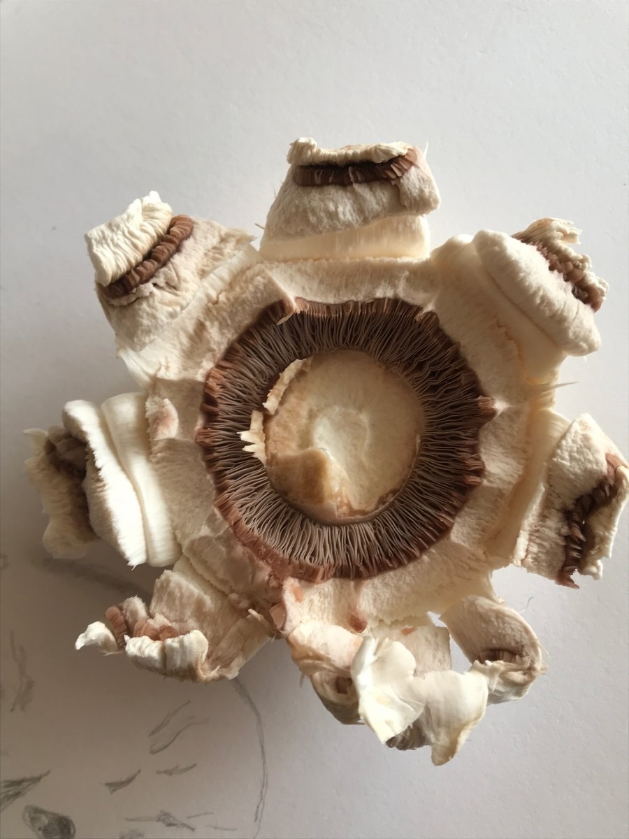 After the exhibition I decided to purchase my own mushroom and explore printing with it. I also dissected the vegetable to consider the delicacy of its various textures.