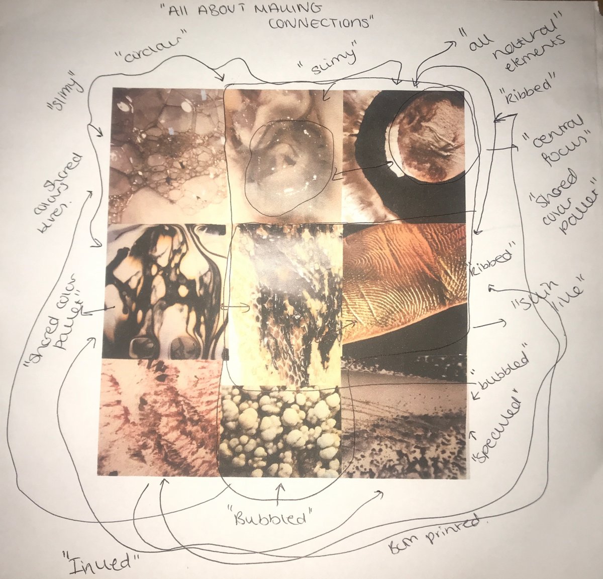 After placing my blown up A3 on my wall to act as a giant moodpboard, I began visually to make connections between the textures that had all caught my eye. Similar colours, textures, shapes... I found this really useful as when it comes to developing more definitive samples, looking back at the shapes, colours... that initially grabbed me, will influence and help me decision make.