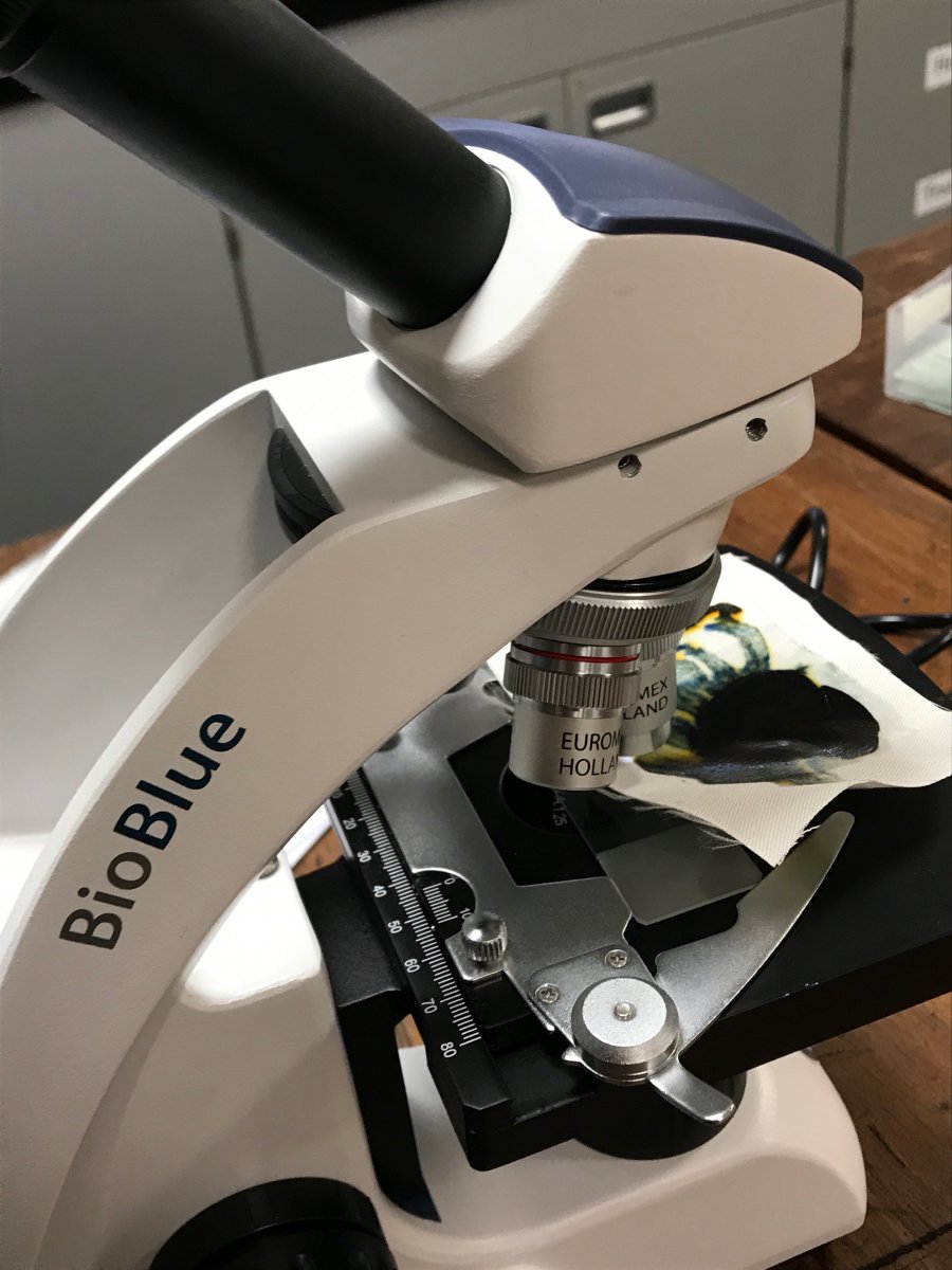 Whilst using Fortismere's Microscope, I learnt the basics of preparing my microscope and the instructions for using powers X4, X10 and X40. After setting up the microscope and preparing the slide I began to place each of my previously made samples and experiments under the lens. Each sample appeared totally different but equally as beautiful in their own way. I was so intrigued that the eye of the microscope can make something I would ordinarily look at, completely different. Each of their textures are so intense and exciting, incredibly inspiring to both draw and make from.