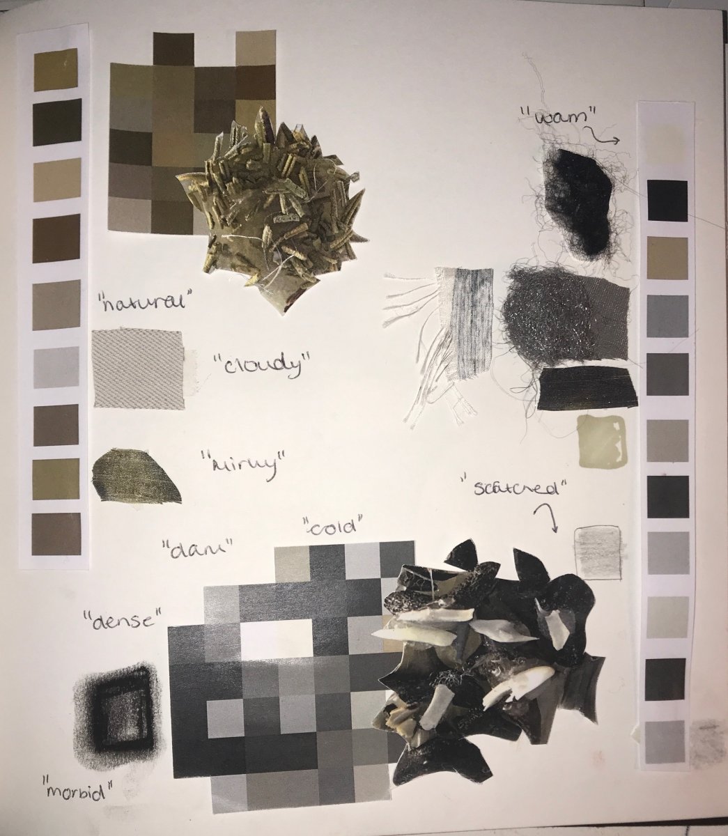 After creating my digital mosaics yesterday, I spent sometime this afternoon exploring the colours with various yarns, paints and materials- connecting them by colour. I also considered words I would use to describe these colours. For one particular page which I have photographed to include within my research, I collected the words...