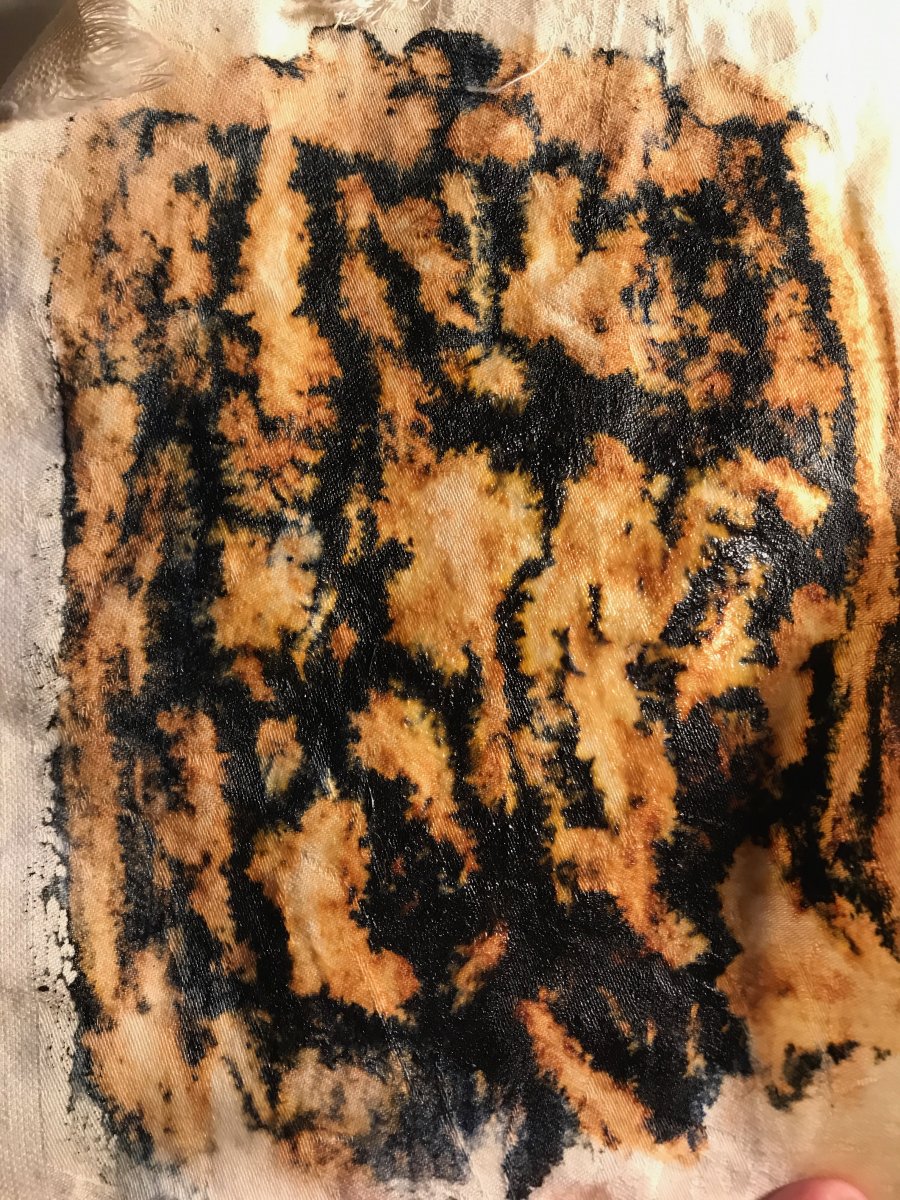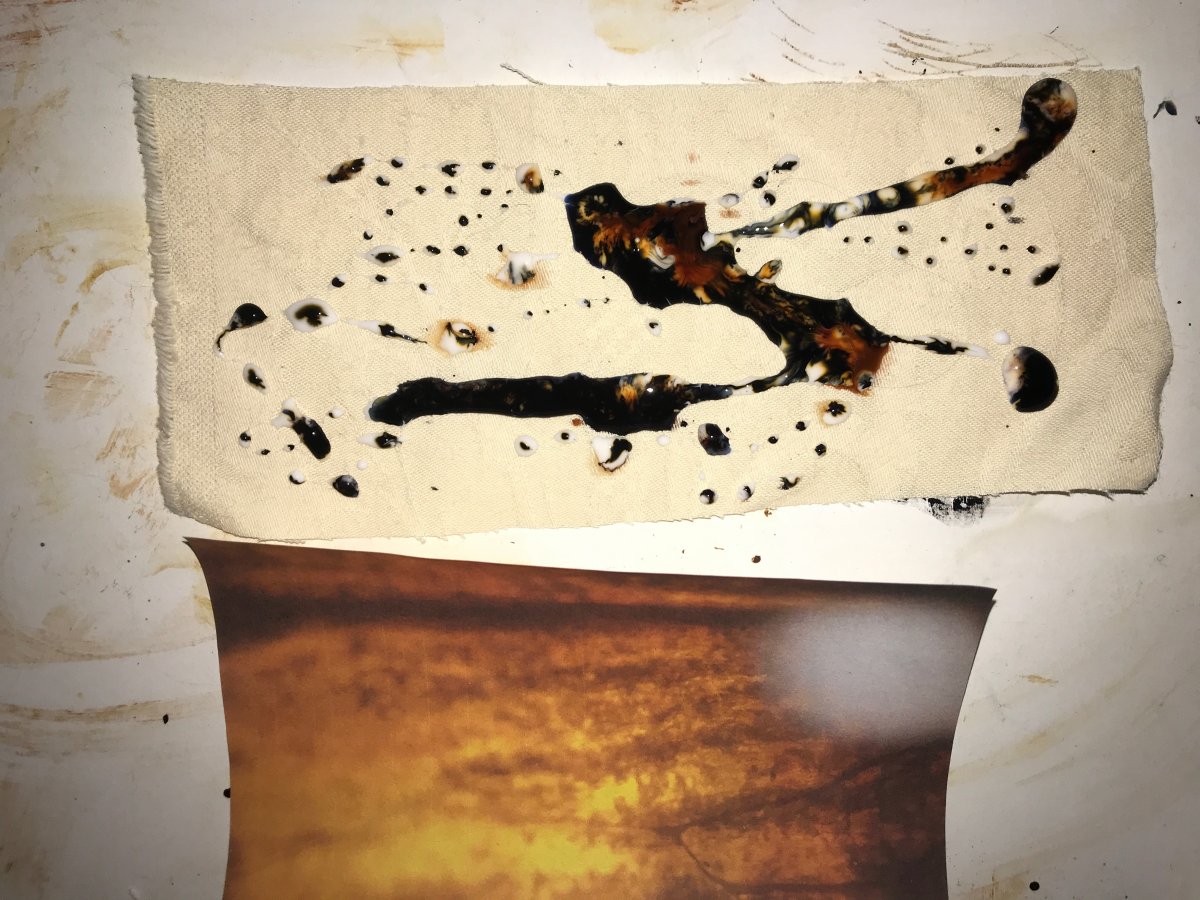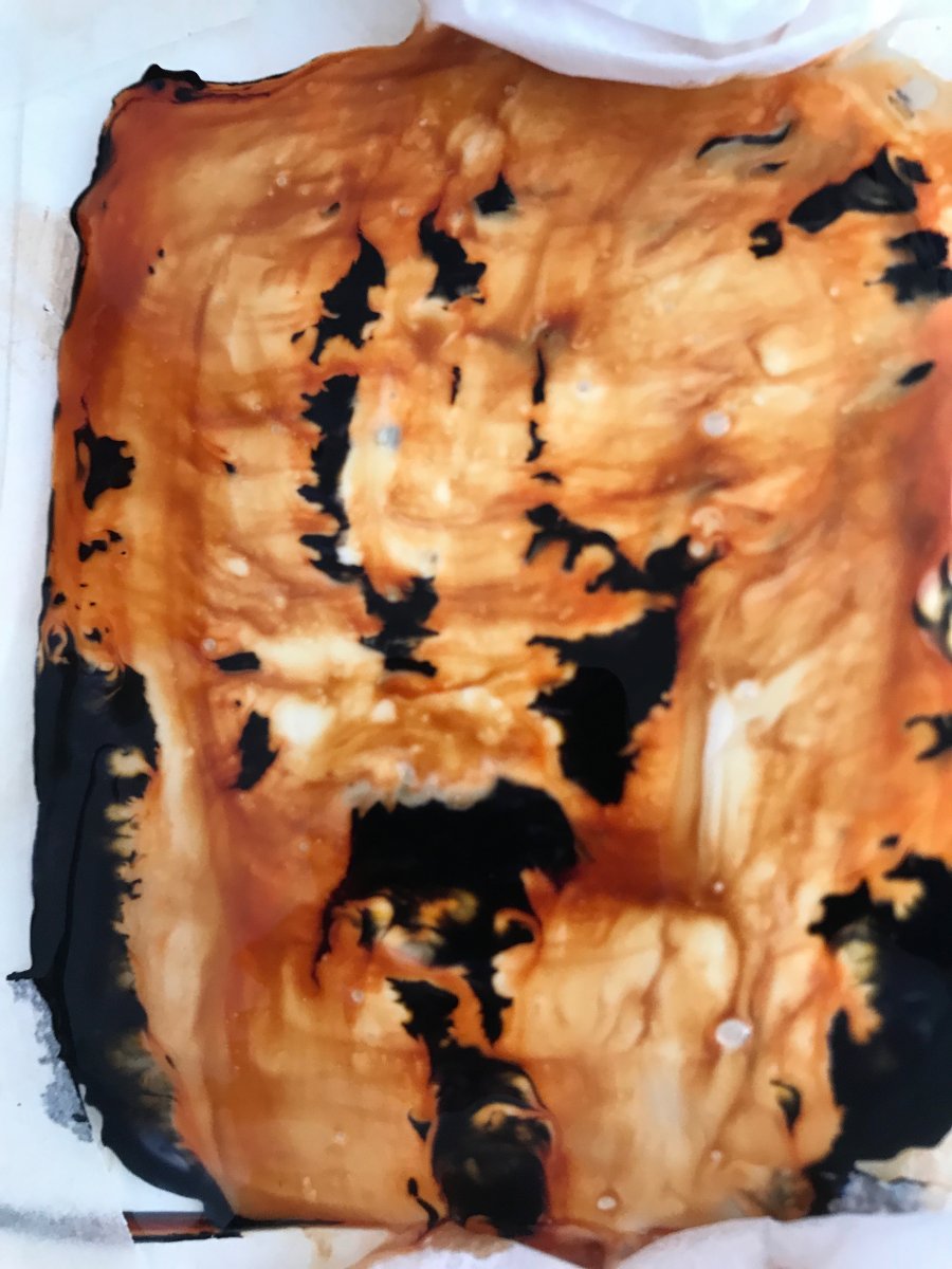 Today was my first day of experimental making based on one of my textural images from my earlier experimentations, which I placed under the microscope. It is also the first time I have begun to make samples influenced by my final colour pallet. Within my experimental research, I made connections to similar textures which is evident in some of my samples. One in particular is influenced by slabs of caramel which is incredibly similar to my original microscopic image. I revised earlier methods I had experimented with including my rust printing however decided to try other chemical reactions in the hope I would hit on something interesting. I decided to experiment with ink and bleach to create the naturally worn and stripped away texture of rust. I played around with the right consistency of water to bleach in order to create various similar shades which would blend into each other, appearing more authentic.