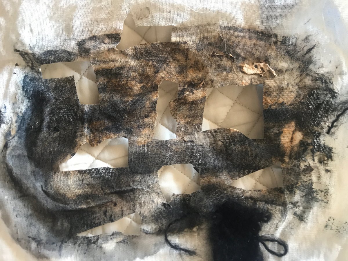 “I also love the stitching you've applied, you have created a natural “lesion” (a region in an organ or tissue which has suffered damage through injury or disease, such as a wound, ulcer, abscess, or tumour.) * I felt this was a very interesting observation, my attempt to create samples based on my research of “living” microscopic beings I felt had paid off, because through my stitching she had observed a section which appeared alive to her.