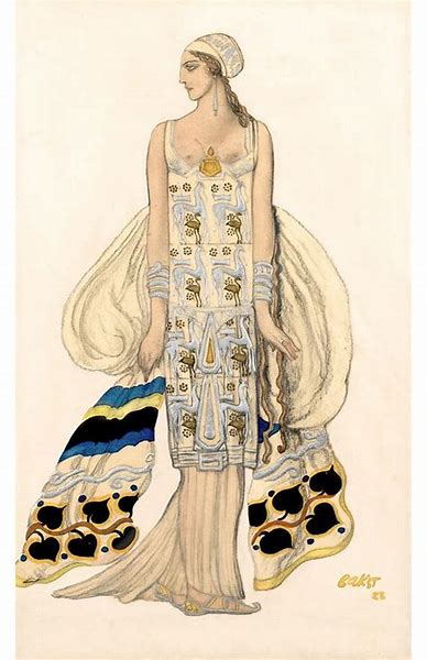 Leon Bakst, was one of Diaghilev early collaborators, his sets and costume designs utilised rich colour, patterns and a very strong eastern and folk influence. His bold designs featured a wonderful mix of sheers, patterns and exotic silhouettes.
